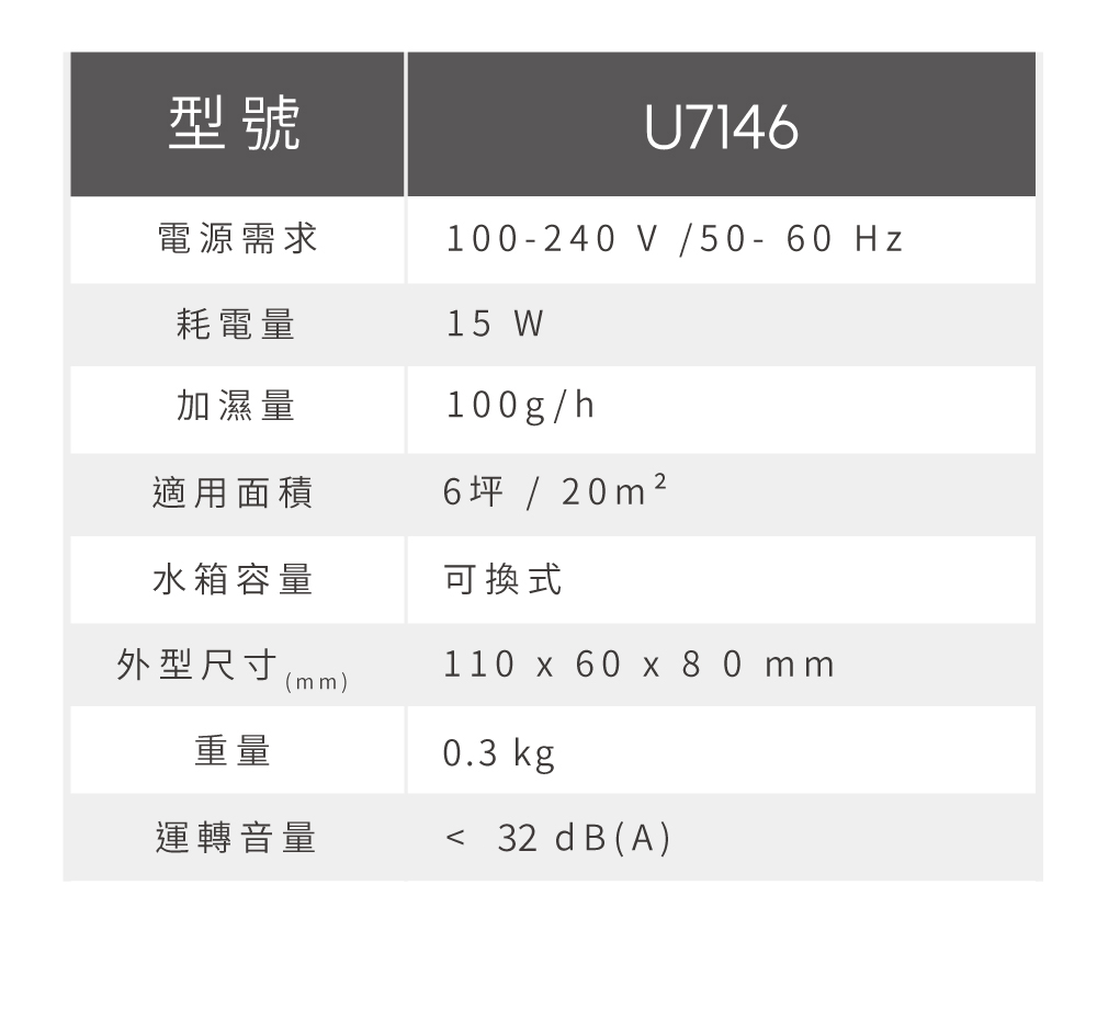 U7146採用超音波高頻振盪技術,產生細微的負離子水霧,同時快速揮發,負離子可幫助肌膚保濕、抗氧化,避免皮膚失去彈性、產生皺紋,並可改善失眠症狀,避免喉嚨乾燥,造成夜咳而影響睡眠品質。U7146機體配有藍光LED燈裝置,夜晚睡覺時可當小夜燈使用。有了U7146,您的肌膚將會整天滋潤舒適。